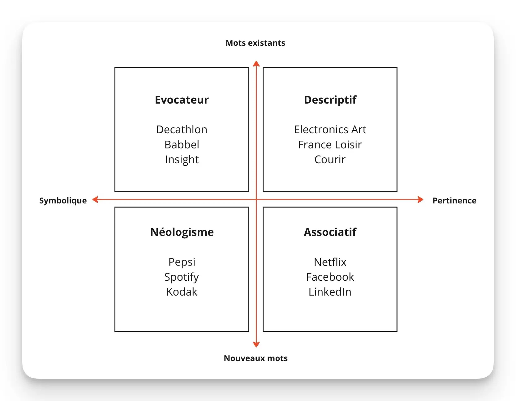 Exemple : Insight (évoque la perspicacité), Babbel (évoquant la mythologie de la tour de Babel), Decathlon (évoquant des sports multiples).