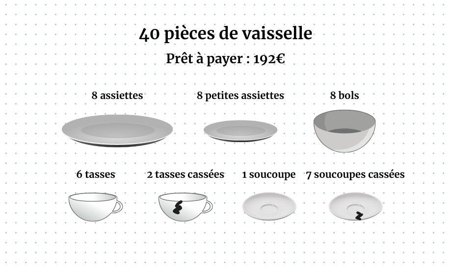 Le service B comprend exactement les mĂȘmes piĂšces que le service A, plus 6 tasses et 1 soucoupe intactes ! Pourtant, la prĂ©sence de quelques piĂšces cassĂ©es fait chuter le prix que les gens sont prĂȘts Ă payer.