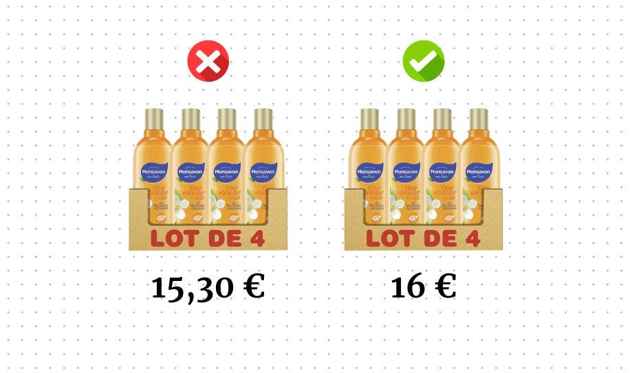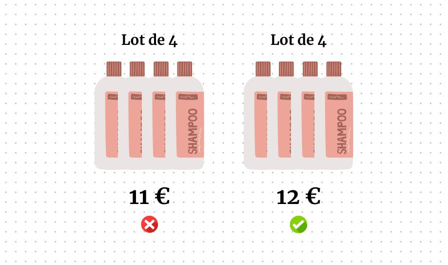 Un prix divisible (15€ ÷ 3 = 5€ par unité) permet aux consommateurs de se concentrer sur le prix à l’unité et de visualiser plus facilement la consommation rapide de chaque unité.